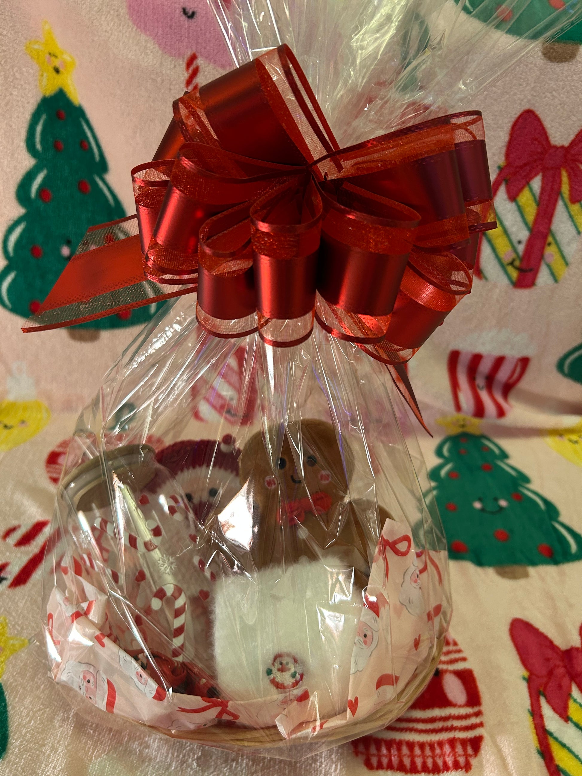 The holiday special Christmas Gift Basket is filled with cozy holiday delights, perfect for spreading seasonal cheer. Inside, you’ll find an adorable gingerbread man plushy a crocheted Santa coaster, and a festive glass Christmas tumbler ready for your favorite winter drinks. To add even more comfort and charm, the basket includes a Christmas-themed scrunchie and fluffy socks ideal for snuggling up on cold nights. Beautifully arranged in a classic hamper basket, wrapped in clear cellophane, and finished with a festive bow, this basket makes a wonderful gift for yourself or a thoughtful present for friends and family.